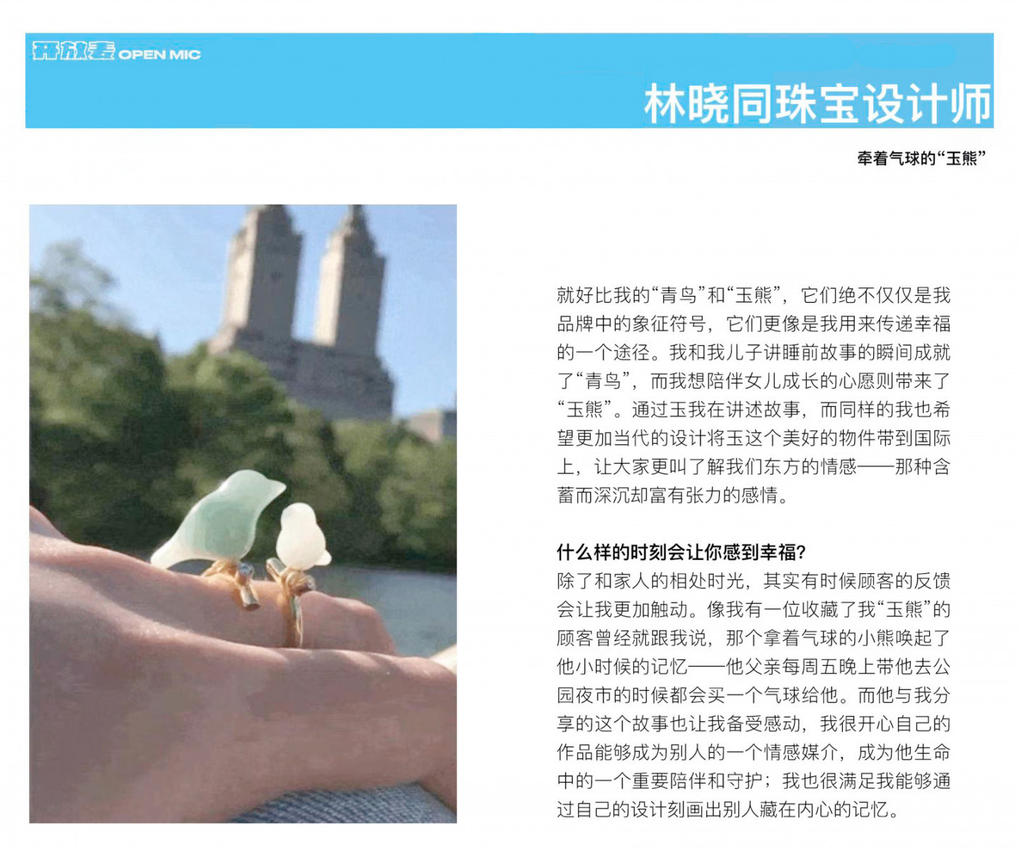 2023年金秋,林曉同珠寶北京旗艦店正式進駐僑福芳草地購物中心,中國版VOGUE+在開幕期間獨家專訪林曉同設計師。從對於幸福定義的探索開始,帶領讀者完整探索品牌經典系列「幸福青鳥」、「陪伴玉熊」的誕生故事。