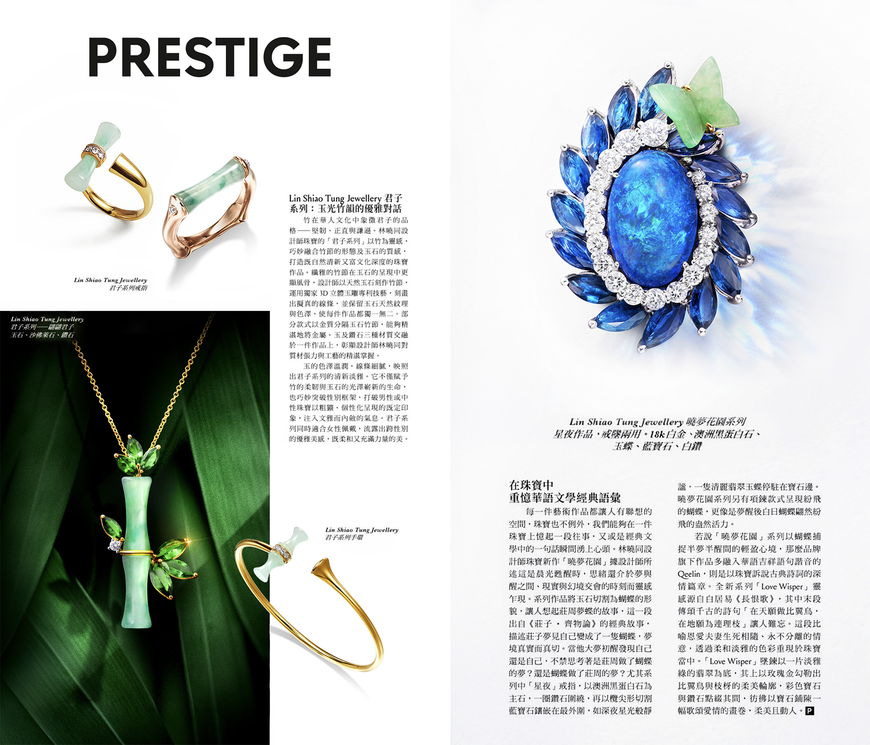 在華人文化中,玉石不僅源自大地的珍寶,更承載著深厚的情感與文化意涵。當代亞洲珠寶設計師試圖將這份傳統底蘊與現代設計語彙融合,創造出兼具文化深度與當代美感的作品,成為象徵華人文化的獨特篇章。例如,Lin Shiao Tung Jewellery 以竹為靈感,打造彰顯君子氣韻的「君子系列」……